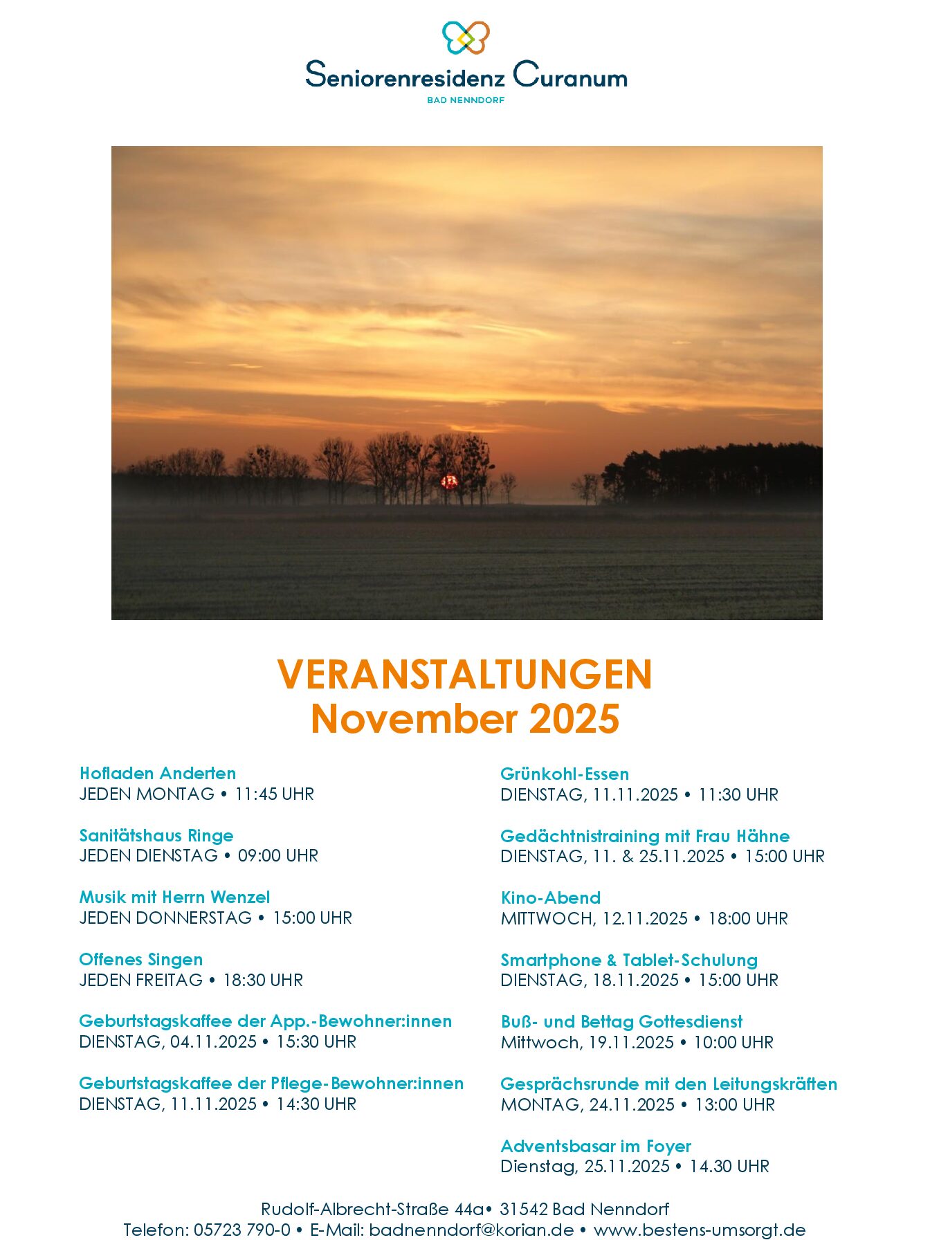 Dort wo andere Urlaub machen, in unmittelbarer Nähe zu den Naherholungsgebieten Steinhuder Meer und Deister, befindet sich die Seniorenresidenz Curanum Bad Nenndorf. Wir sind nicht einfach nur ein Pflegeheim, denn wir bieten Ihnen alles aus einer Hand: vom Betreuten Wohnen bis hin zur Kurzzeit- oder stationären Dauerpflege.