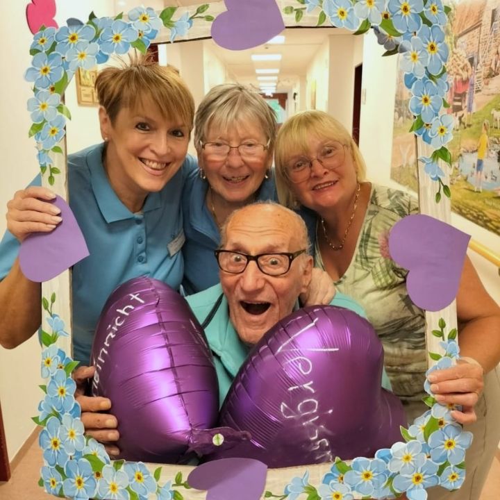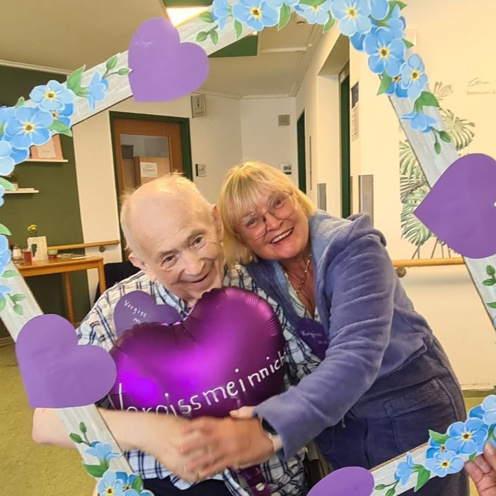 Die Bewohner:innen und Mitarbeiter:innen aus dem Haus Maxhütte in Haidhof haben sich am 13. September gemeinsam in ihre Bademäntel geworfen und vor einem selbstgebastelten Vergissmeinnicht-Bilderrahmen posiert. Die Blume steht für Erinnerung und Treue, die Farbe Lila für Mitgefühl und Hoffnung.