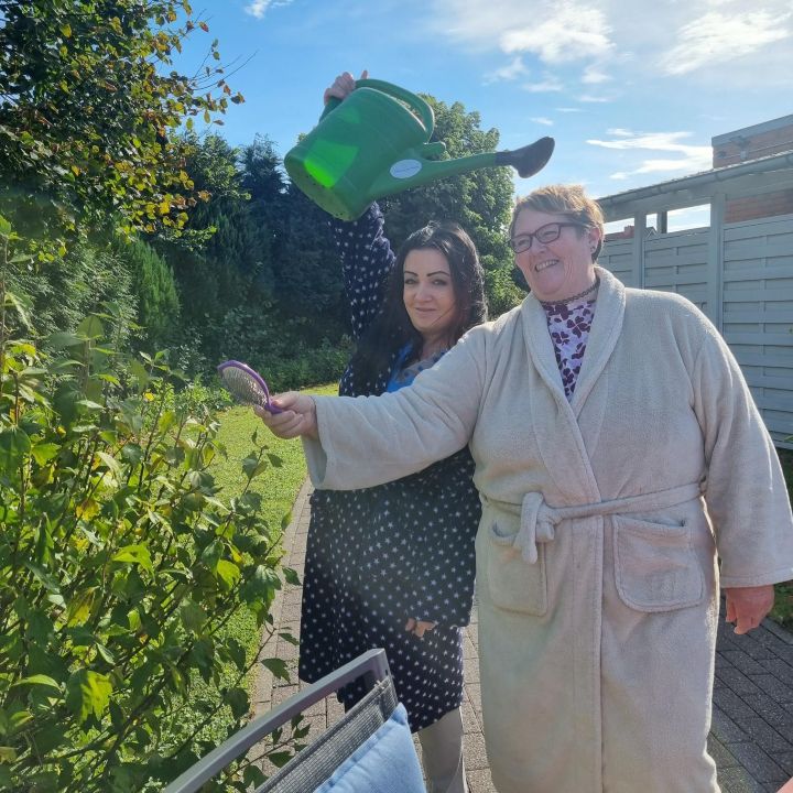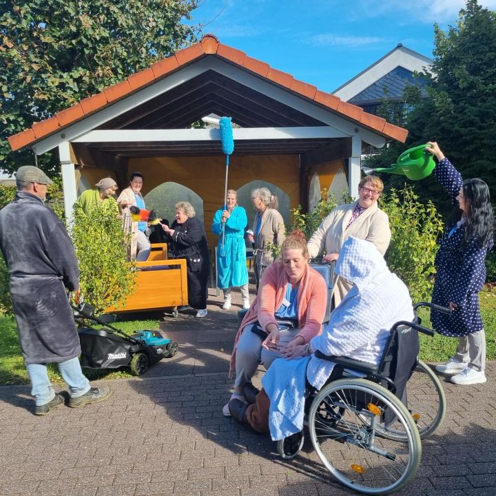 Auch die Mitarbeiter:innen und Bewohner:innen aus dem Haus an der Heide Stelle verbrachten den Tag im Bademantel. Mit verschiedenen nachgestellten Szenen wollen sie zeigen, was manchmal in den Köpfen Demenzerkankter vorgeht – da werden schon mal die Haare gegossen und die Blumen gekämmt, statt umgekehrt.